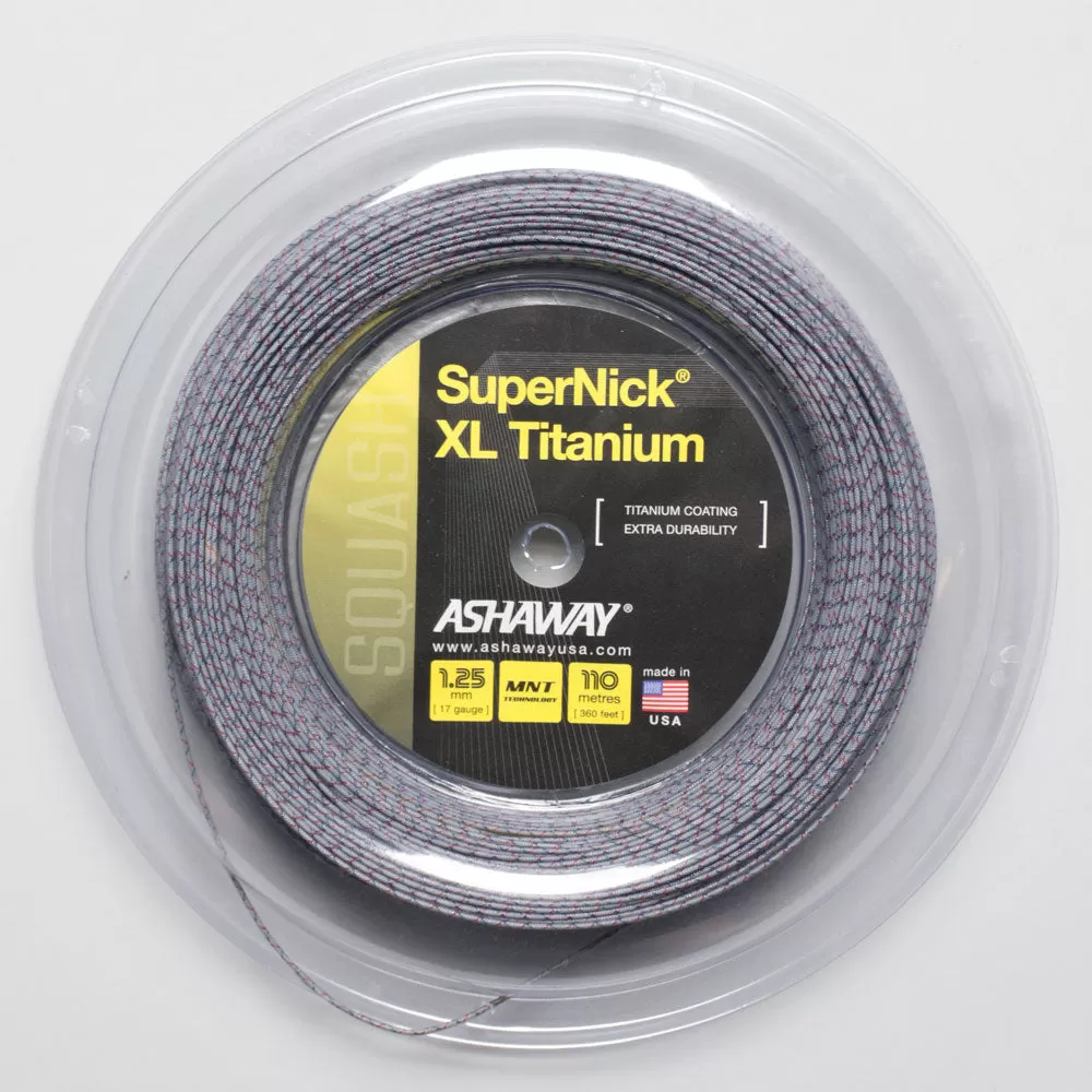 Ashaway SuperNick XL Titanium 17 360 squash string gives players extra durability in a multifilament nylon string. The textured surface offers optimum ball control. Ideal for top professionals and amateur players.