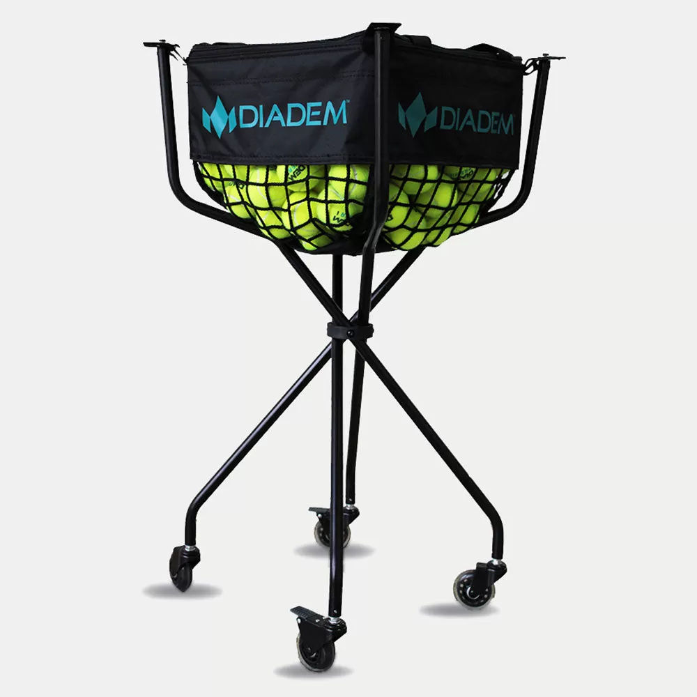 Introducing the next evolution in portable ball carts. The Diadem Ball Cart 150 Balls uses unique cross configuration legs and larger wheels to increase stability. The lightweight aluminum frame won’t rust in tough conditions, and netting on the lower portion bag allows airflow in windy environments. Easy lock rings clip on and allow you to take off the bag when you want, and locking wheels keep your cart in place when necessary. Stable, portable, and durable: The Diadem Ball Cart 150 balls takes your training to another level!
