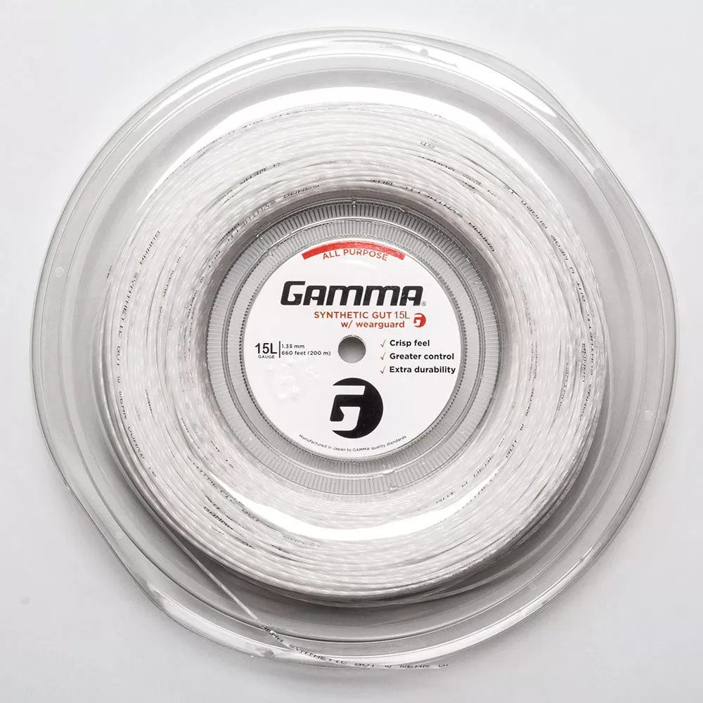 The Gamma Synthetic Gut 15L 660′ Reel Wearguard tennis string offers longer life and enhanced playability for all playing levels and styles. The super resilient Dynalon Center Core delivers increased power, while WearGuard Wear Resistant Fibers provide a longer string life with a crisp feel.