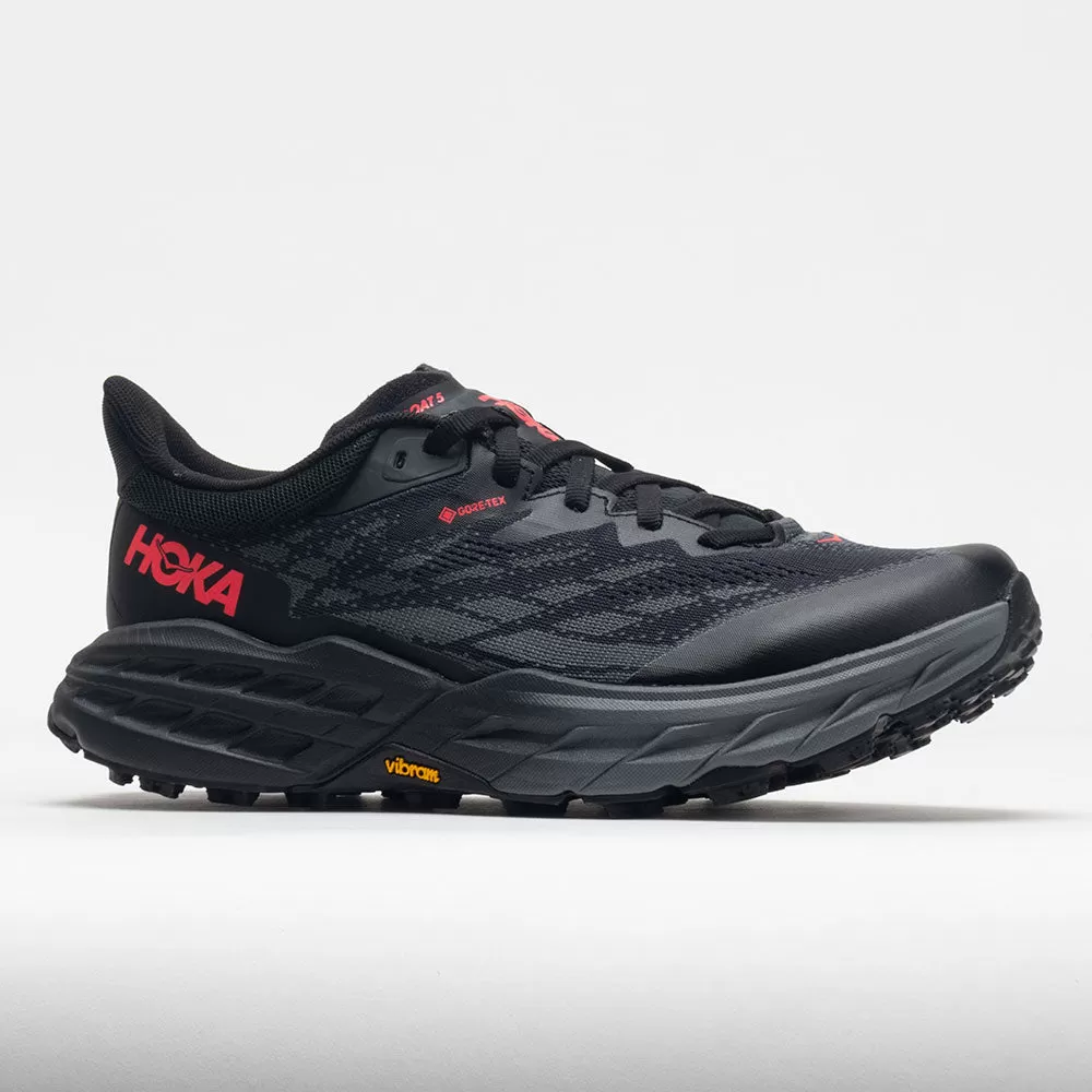 Grippy and cushioned, the HOKA Speedgoat 5 GTX is a speedy trailblazer! This trail-ready workhorse features a GORE-TEX waterproof membrane to keep you safe in wet conditions. The Vibram® Megagrip outsole provides reliable traction on sloppy terrain. For runners and hikers who want to fly over wet and rocky roads, the HOKA Speedgoat 5 GTX prevails on any trail!