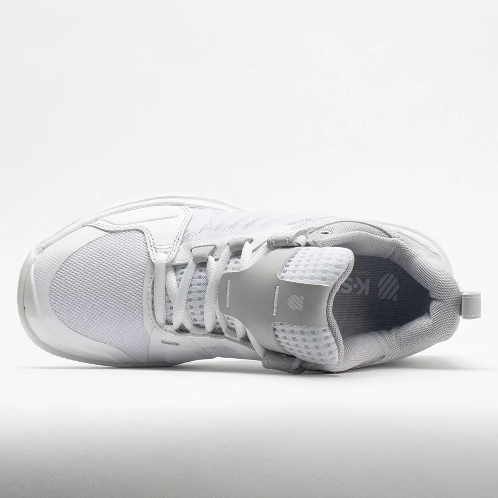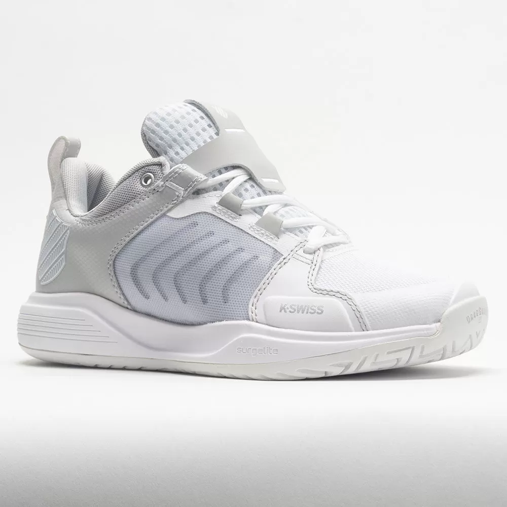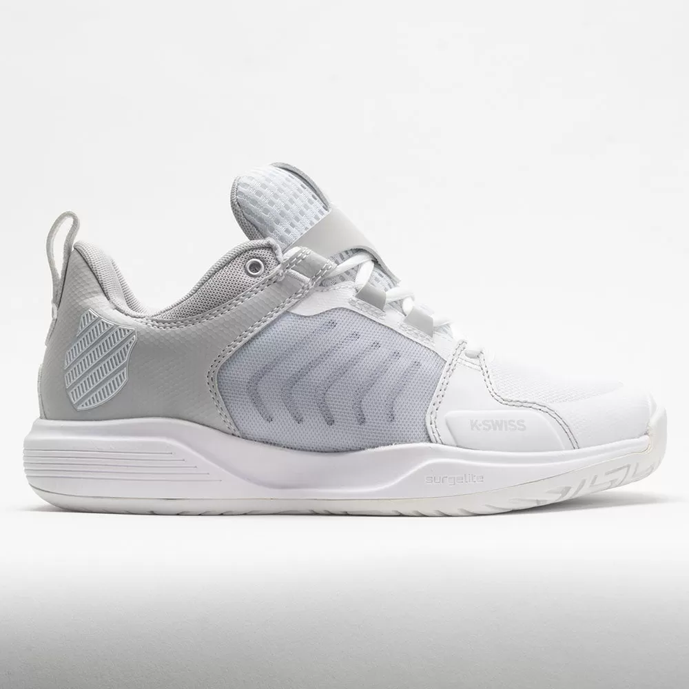 The latest member of the Ultra family, the K-Swiss Ultrashot Team provides support and durability for various playing surfaces. This budget-friendly version of the Ultrashot 3 tennis shoe offers signature stability and comfort at a better value. Slide into a light and breathable mesh upper with translucent paneling for sophisticated style. Stay energized during long matches on the lightweight Surge 7.0 midsole. Key visual elements like the five chevron stripes on the quarter and enlarged shield logo on the heel create a tennis/lifestyle vibe every time you take the court.