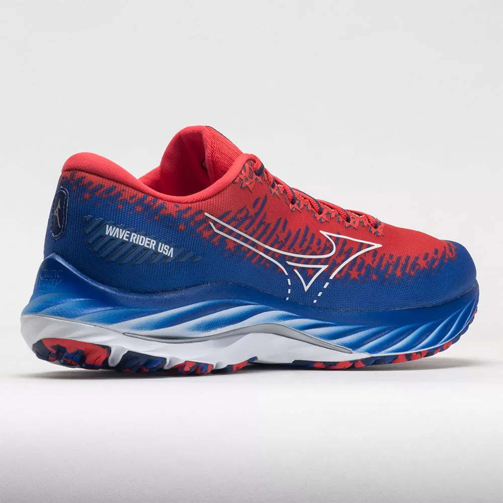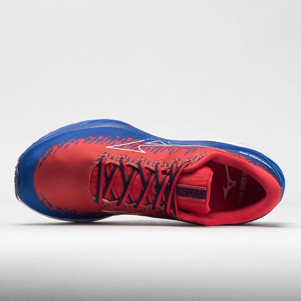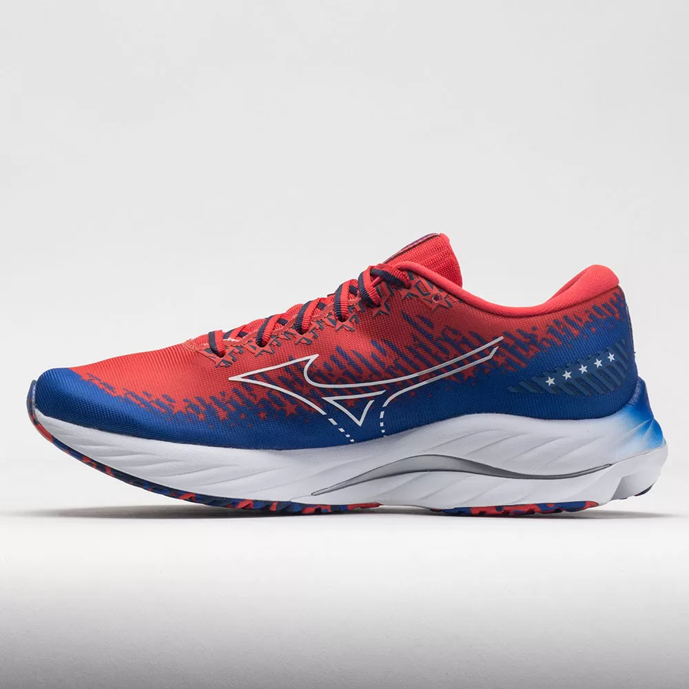 Show your pride with every stride in the Mizuno Wave Rider USA! Upgraded with a lighter upper and refined heel fit, this neutral running shoe offers the perfect formula for smooth daily runs. Slip into a breathable jacquard mesh upper and stay cool while you cruise. Enjoy smooth landings on the MIZUNO ENERZY midsole as the MIZUNO WAVE® plate leads quick transitions. Comfortable and stylish, the Mizuno Wave Rider USA stays true to the stars and stripes theme!