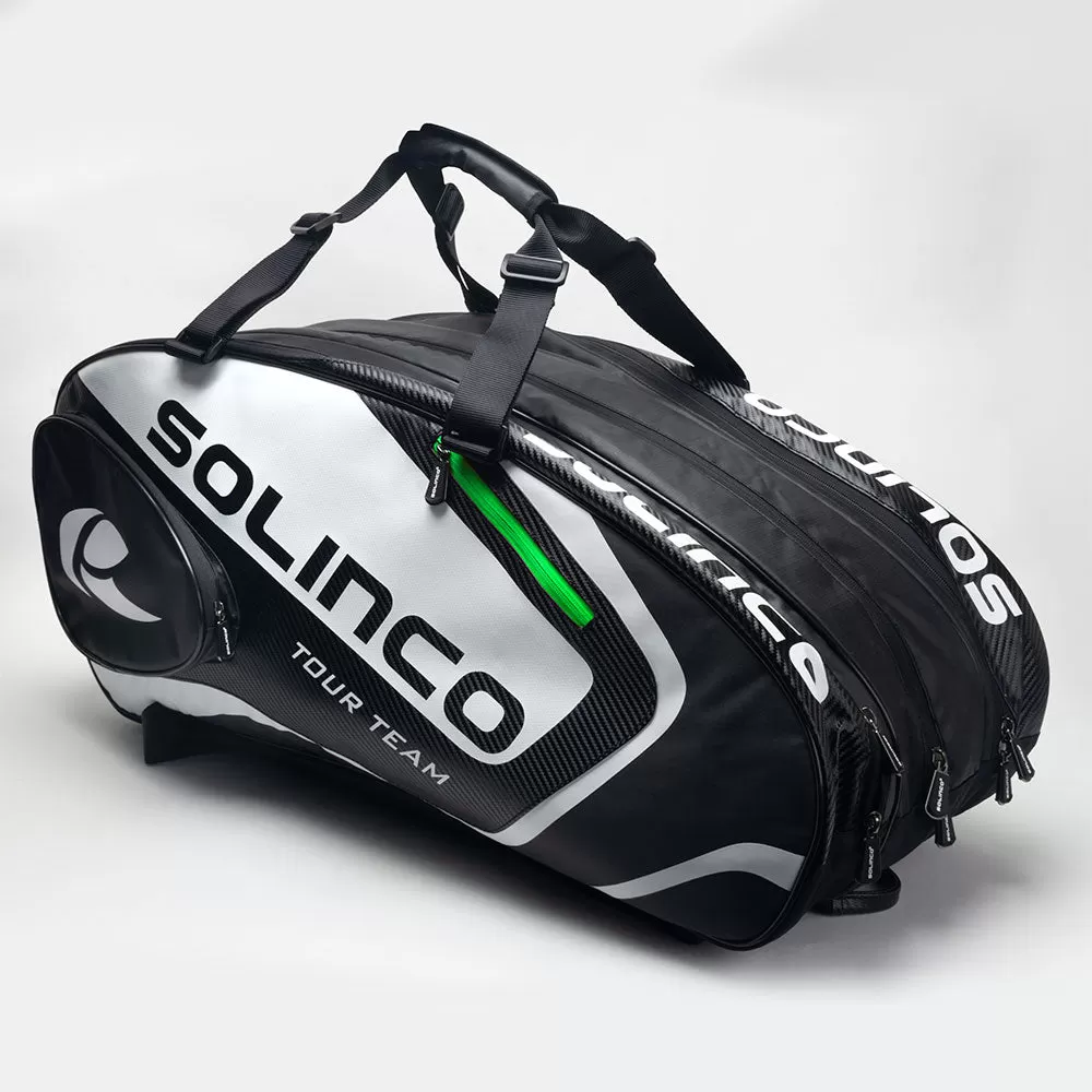 The Solinco Tour 15-Pack Racquet Bag in Green provides ample space for up to 15 of your favorite tennis racquets. Three, large main compartments provide the organization of your favorite frames, with the two outside sections offering protection from very high or low temperatures. Tennis players and pros alike will appreciate the highly durable material and bold Solinco callouts on these perfect travel tennis bag.