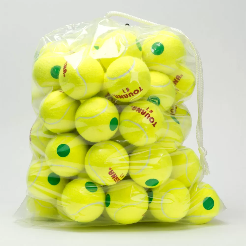 Tourna Pressurized Green Dot 60 pack of Balls feature 25% lower pressure and lower bounce than standard tennis balls.This 60 pack is perfect for skill development and practice.